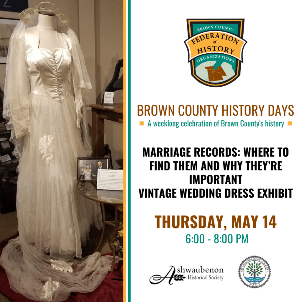 Join the Ashwaubenon Historical Society and Bay Area Genealogical Society for an evening of marital bliss. During this event, guests will explore Ashwaubenon’s vintage wedding dress collection, which displays dresses worn by local women dating from as early as the turn of the 20th century. Starting at 6:30 p.m., the Bay Area Genealogical Society will share their expertise on the best ways to explore marriage records and the valuable information they contain.