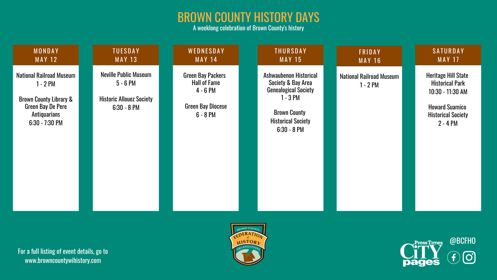 Explore Brown County’s history with a week of FREE programs. The public is invited to check out a slate of exciting and diverse events presented by expert staff in unique historical environments. Go to one location, or try and make them all!